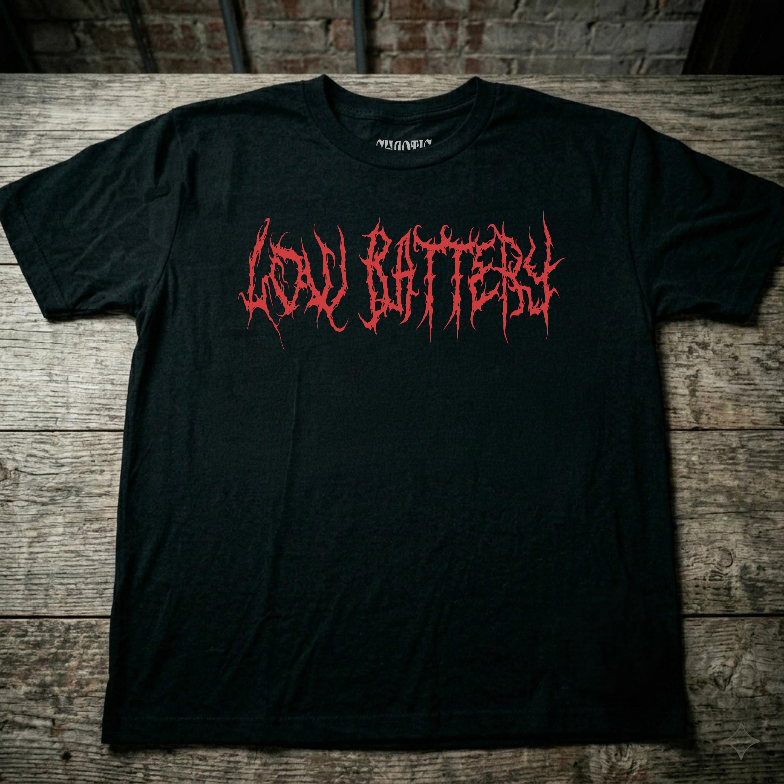 A heavy metal style LOW BATTERY t-shirt with a wicked gothic style font in red.